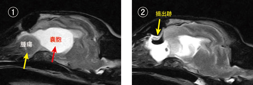 症例 ②犬、退形成性髄膜腫(グレードⅢ)・嚢胞形成あり、前頭葉から嗅球に発生
