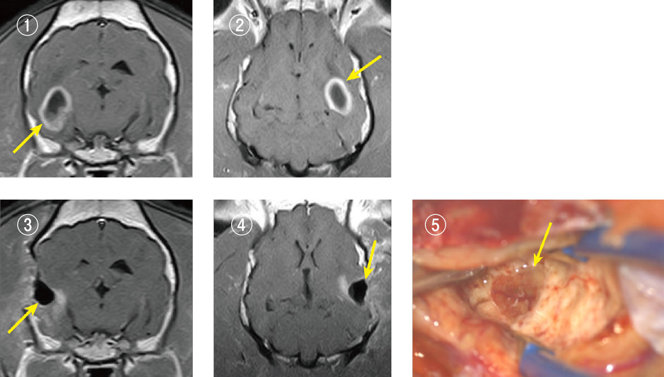 12歳のフレンチブルドックが発作で来院し、MRI検査で左の側頭葉内にリング状に造影される腫瘍が発見されました。脳の深い場所に腫瘍があり、正常な脳との区別が困難なことがあるため事前に染色液で腫瘍を黄色に染めておき、脳を切開して腫瘍に到達し可能な限り除去しました。病理検査では、退形成性希突起膠細胞腫と診断され、極めて悪性の脳腫瘍であることが判明したため、抗がん剤療法を行いました。その後しばらくして再発はみられましたが、ご家族との幸せな時間を過ごすことができました。
