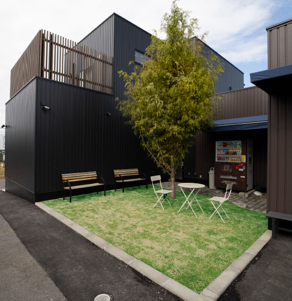 他の動物が苦手な子や体格の大きな子が快適に過ごせるよう、公園のような外待合を作りました。温かい時期は芝生も生え、足洗い場や自動販売機、ベンチもあります。 -