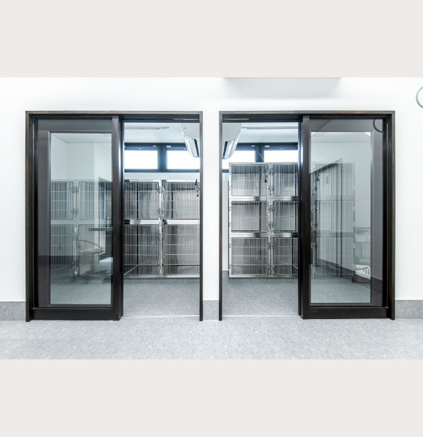 小型、大型犬の入院に対応したケージを導入しています。エアコンで24時間温度管理し、処置室から常に監視できるように正面はガラス張りになっています。 -