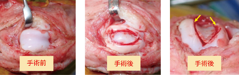 (くさび型滑車形成術:膝蓋骨が通る溝をくさび型に切り、一段溝を低くして軟骨を元 の位置に戻しています。矢印が低くなった段差。)