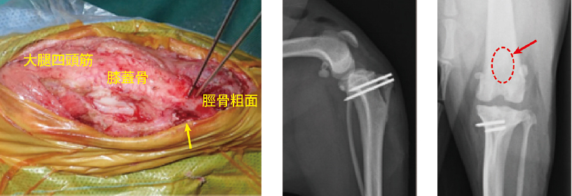 黄色矢印が移動した部分。手術後の X 線検査で2 本のピンが確認でき、膝蓋骨が正しい位置に戻っています〔赤矢印〕。) 外側関節包の縫縮:伸びきった外側の関節包を縫い縮め、膝蓋骨を外側に引っ張ります。